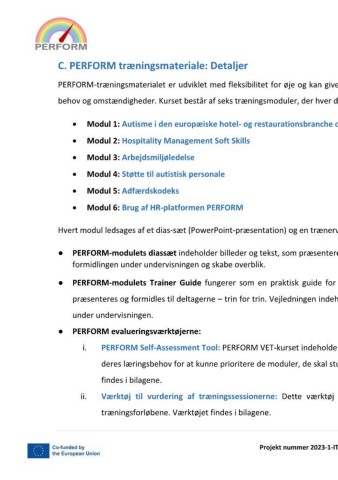 ● PERFORM-modulets Trainer Guide fungerer som en praktisk guide for underviseren. Den giver en klar gennemgang af, hvordan hvert modul kan