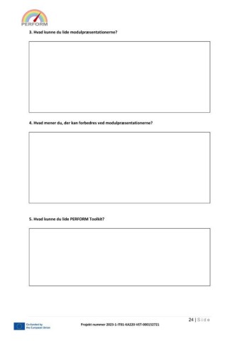 3. Hvad kunne du lide modulpræsentationerne? 4. Hvad mener du, der kan forbedres ved modulpræsentationerne? 5. Hvad kunne du lide PERFORM Toolkit? 24 | S i d e Projekt nummer 2023-1-IT01-KA220-VET-000152721