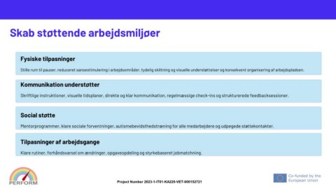 Mentorprogrammer, klare sociale forventninger, autismebevidsthedstræning for alle medarbejdere og udpegede støttekontakter.