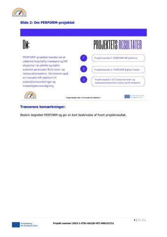 Slide 2: Om PERFORM-projektet Trænerens bemærkninger: Beskriv begrebet PERFORM og giv en kort beskrivelse af hvert projektresultat. 4 | S i d e Projekt nummer 2023-1-IT01-KA220-VET-000152721