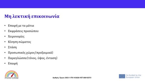 Μη λεκτική επικοινωνία • Επαφή με τα μάτια • Εκφράσεις προσώπου • Χειρονομίες • Κίνηση σώματος • Στάση • Προσωπικός χώρος (προξαιμικά) • Παραγλώσσα (τόνος, ύψος, ένταση) • Επαφή Αριθμός Έργου 2023-1-IT01-KA220-VET-000152721