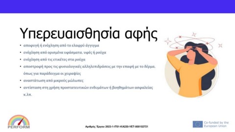• ενόχληση από ορισμένα υφάσματα, υφές ή ρούχα