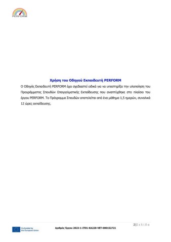 έργου PERFORM. Το Πρόγραμμα Σπουδών αποτελείται από ένα μάθημα 1,5 ημερών, συνολικά