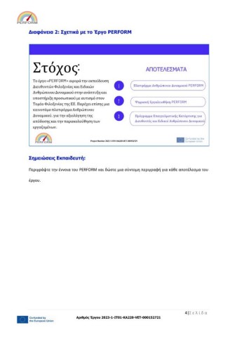 Διαφάνεια 2: Σχετικά με το Έργο PERFORM Σημειώσεις Εκπαιδευτή: Περιγράψτε την έννοια του PERFORM και δώστε μια σύντομη περιγραφή για κάθε αποτέλεσμα του έργου. 4|Σ ε λ ί δ α Αριθμός Έργου 2023-1-IT01-KA220-VET-000152721