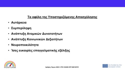 Τα οφέλη της Υποστηριζόμενης Απασχόλησης • Αυτάρκεια • Συμπερίληψη • Ανάπτυξη Ατομικών Δυνατοτήτων • Ανάπτυξη Κοινωνικών Δεξιοτήτων • Νευροποικιλότητα • Ίσες ευκαιρίες επαγγελματικής εξέλιξης Αριθμός Έργου 2023-1-IT01-KA220-VET-000152721