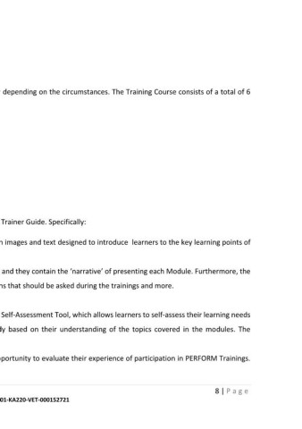 ● The PERFORM Module Trainer Guide acts as a Training Guide for Trainers and they contain the ‘narrative’ of presenting each Module. Furthermore, the
