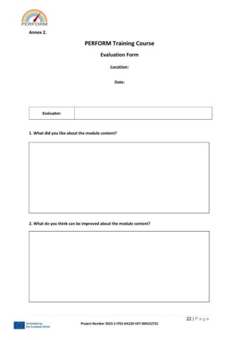 Annex 2. PERFORM Training Course Evaluation Form Location: Date: Evaluator: 1. What did you like about the module content? 2. What do you think can be improved about the module content? 22 | P a g e Project Number 2023-1-IT01-KA220-VET-000152721