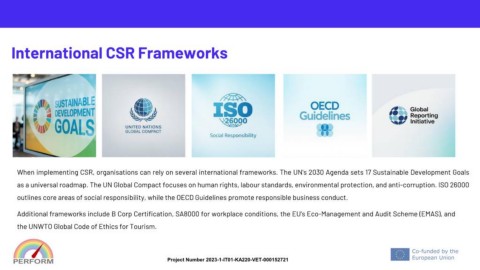 When implementing CSR, organisations can rely on several international frameworks. The UN's 2030 Agenda sets 17 Sustainable Development Goals