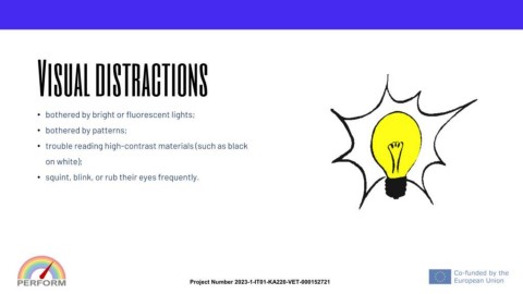 Visual distractions • bothered by bright or fluorescent lights; • bothered by patterns; • trouble reading high-contrast materials (such as black on white); • squint, blink, or rub their eyes frequently. Project Number 2023-1-IT01-KA220-VET-000152721