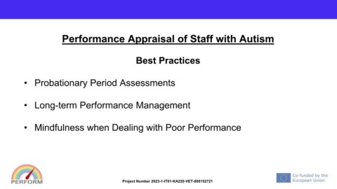 Performance Appraisal of Staff with Autism Best Practices • Probationary Period Assessments • Long-term Performance Management • Mindfulness when Dealing with Poor Performance Project Number 2023-1-IT01-KA220-VET-000152721