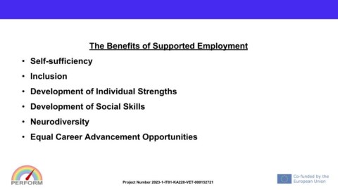 The Benefits of Supported Employment • Self-sufficiency • Inclusion • Development of Individual Strengths • Development of Social Skills • Neurodiversity • Equal Career Advancement Opportunities Project Number 2023-1-IT01-KA220-VET-000152721