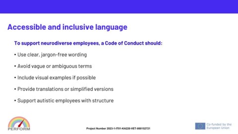To support neurodiverse employees, a Code of Conduct should: