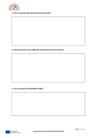 3. Cosa ti è piaciuto della presentazione del modulo? 4. Cosa pensi possa essere migliorato nella presentazione del modulo? 5. Cosa ti è piaciuto del PERFORM Toolkit? 28 | P a g e Project Number 2023-1-IT01-KA220-VET-000152721