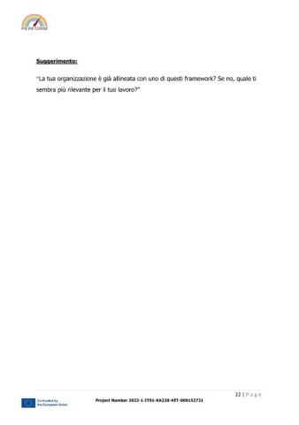 Suggerimento: “La tua organizzazione è già allineata con uno di questi framework? Se no, quale ti sembra più rilevante per il tuo lavoro?” 22 | Pa ge Project Number 2023-1-IT01-KA220-VET-000152721