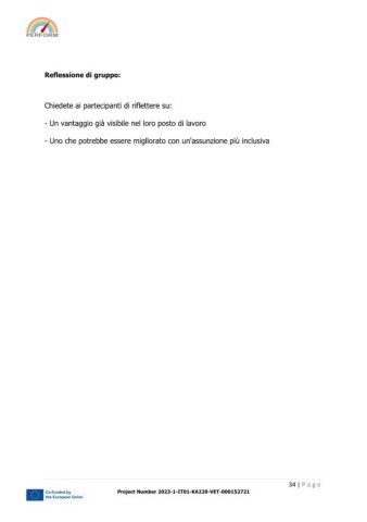 Reflessione di gruppo: Chiedete ai partecipanti di riflettere su: - Un vantaggio già visibile nel loro posto di lavoro - Uno che potrebbe essere migliorato con un'assunzione più inclusiva 34 | Pa ge Project Number 2023-1-IT01-KA220-VET-000152721