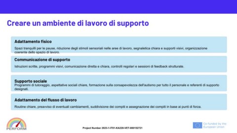 Programmi di tutoraggio, aspettative sociali chiare, formazione sulla consapevolezza dell'autismo per tutto il personale e referenti di supporto