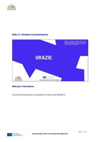Slide 11: Chiudere la presentazione Note per il formatore: Concludi la presentazione riassumendo il contenuto del Modulo 4. 14 | Pa ge Project Number 2023-1-IT01-KA220-VET-000152721