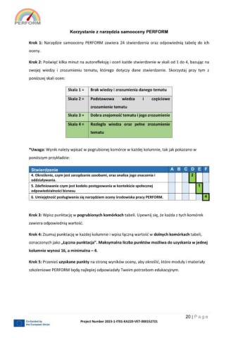 Krok 1: Narzędzie samooceny PERFORM zawiera 24 stwierdzenia oraz odpowiednią tabelę do ich