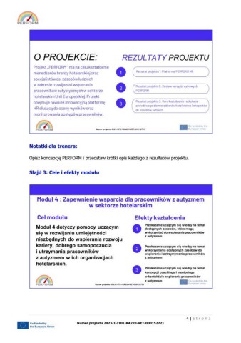 Notatki dla trenera: Opisz koncepcję PERFORM i przedstaw krótki opis każdego z rezultatów projektu. Slajd 3: Cele i efekty modułu 4 | S t r o n a Numer projektu 2023-1-IT01-KA220-VET-000152721
