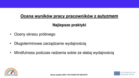 Ocena wyników pracy pracowników z autyzmem Najlepsze praktyki • Oceny okresu próbnego • Długoterminowe zarządzanie wydajnością • Mindfulness podczas radzenia sobie ze słabą wydajnością Numer projektu 2023-1-IT01-KA220-VET-000152721