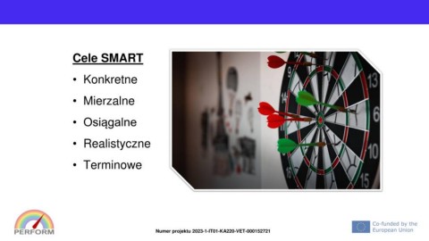 Cele SMART • Konkretne • Mierzalne • Osiągalne • Realistyczne • Terminowe Numer projektu 2023-1-IT01-KA220-VET-000152721