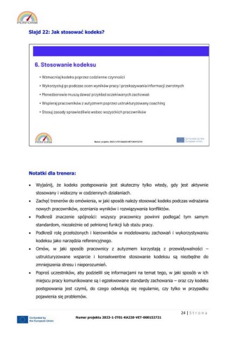 Zachęć trenerów do omówienia, w jaki sposób należy stosować kodeks podczas wdrażania
